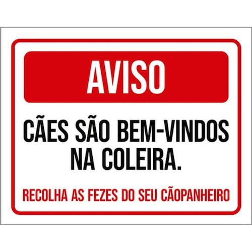 Kit 10 Placas Aviso Cães Bem Vindos Coleira Recolha Fezes Placas de sinalizaço fabricadas com poliestireno de alto impacto PSAI de 2mm e impressão ultravioleta.