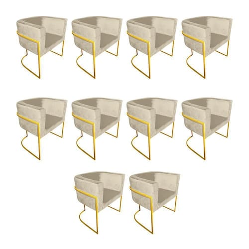 AS IMAGENS SÃO MERAMENTE ILUSTRATIVAS E PODEM SOFRER VARIAÇÕES DE COR E PEQUENOS DETALHES DE ACORDO COM O SEU MONITOR, ILUMINAÇÃO DO AMBIENTE E ATÉ MESMO A SUA PERCEPÇÃO VISUAL.Kit 10 Poltronas Decorativa Sala De Estar Base De Ferro Dourada Veludo Bege