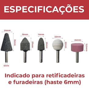 Kit 10 Pontas Montadas Rebolo Abrasivo Haste 6mm Multiuso Bravo Tools - Marca: Bravo Tools - Referência: BV1006 - Indicada para limpezas e acabamentos em superfícies - Diâmetro da haste: 6mm - 2 Ponta Cilíndrica Branca 22 x 22mm Grão Fino - 2 Ponta Tipo Roda Rosa 24 x 12,5mm Grão Médio - 2 Ponta Tipo Bala Cinza 16 x 26mm Grão Grosso - 2 Ponta Tipo Árvore Cinza 24 x 35mm Grão Grosso - 2 Ponta Tipo Cônica Cinza 19 x 27mm Grão Grosso - Material da ponta: Óxido de alumínio Corundum - As pontas montadas são indicadas para uso geral - Uso em retificadeiras e furadeiras de qualquer marca com mandril de 6mm - Indicada para afiação, esmerilhamento e desbaste em metais, joias, pedras preciosas, vidro, entre outros materiais - Ideal para trabalhos detalhados em uma variedade de superfícies, oferecendo remoção de material suave e precisa - Seu formato facilita o trabalho em locais de difícil acesso - Velocidade máxima: 25.000rpm - Peso bruto: 90 gramas - : 90 dias contra defeitos de fabricação Marca: Não Informado Ean: 7734625974844
