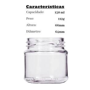 Características: - capacidade: 150 ml - altura: 6,6 cm. - diâmetro: 6,4 cm - peso: 112g - gargalo: 63mm - tampa: 63mm de 4 garras. - denominação: mini belém