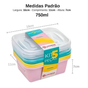 Mantenha seus alimentos sempre frescos e organizados com este conjunto de 5 potes plásticos da Jaguar. Cada pote possui 750ml de capacidade e vem com tampa hermética, garantindo melhor conservação e proteção contra odores externos. Fabricados em material livre de BPA e não tóxico, oferecem segurança para armazenar e consumir seus alimentos. São extremamente versáteis: podem ser levados ao freezer, micro-ondas, geladeira e lava-louças, sem perder qualidade ou resistência. O sistema de abertura fácil com abas laterais facilita o manuseio no dia a dia, enquanto seu design compacto otimiza espaço no armário ou na geladeira. Medidas de cada pote: