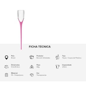 País: Brasil Produtor: Boccati Utilidades Tipo: Taças / Copos de Plástico Dimensões: 5,5 x 35,5cm Peso: 68g Capacidade: 210ml Material Taça: PS (Poliestireno) Material Haste: PP (Polipropileno) Cor Taça: Transparente Cor Haste: Rosa Pink