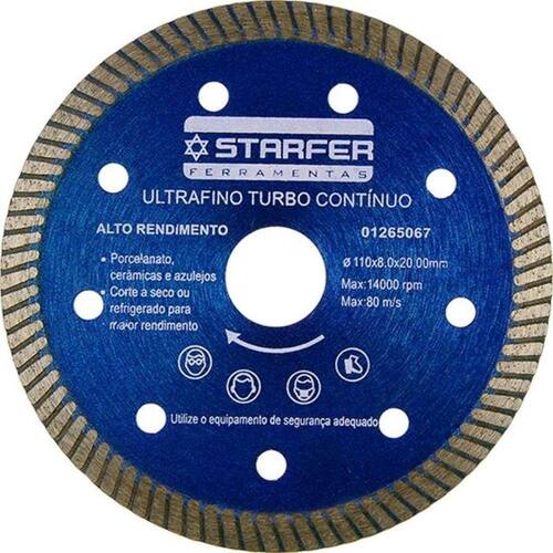Disco em aço carbono com lamina diamantada continua turbo, para corte a seco ou refrigerado. Dimensões: diâmetro do disco 4.3/8" (110mm) x diâmetro do furo 3/4" (20mm) x espessura da lamina 8mm. Para uso em serra mármore. Limite máximo 14000rpm, 80m/s. Indicado para corte ultrafino com acabamento liso em porcelanatos, cerâmicas e azulejos.Ref.: 01265067Marca: Starfer