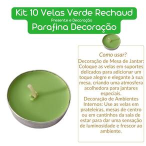 Kit 10 Velas Verde Rechaud Parafina Decoração Kit com 10 Velas Verde Rechaud Parafina, ideais para trazer sofisticação e um toque natural à sua decoração. Feitas com parafina de alta qualidade, essas velas oferecem uma queima limpa e duradoura, além de proporcionarem um ambiente aconchegante e cheio de charme. Perfeitas para diversos estilos de decoração, elas criam um efeito encantador onde quer que sejam usadas. Como você pode usar o Kit de Velas Rechaud Verdes: