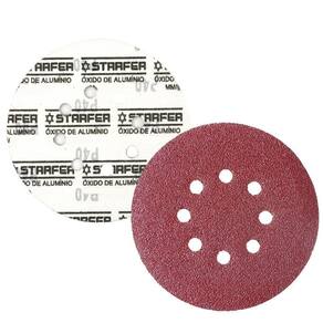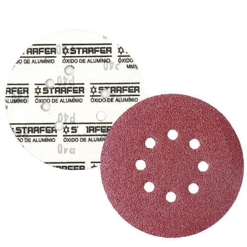 CARACTERÍSTICAS TÉCNICAS: Material: Resina, óxido de alumínio, papel e pluma Medidas: 180mm 7 Quantidade de furos: 8 Limite máxima: 12.220rpm - 80m/s Grão: 40 Quantidade: 100 unidades Marca: Starfer Ref.: 4000528