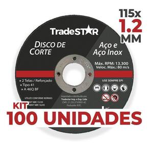 Adquira já o Kit 100 Discos de Corte Metal Inox 115x1,2mm Esmerilhadeira e tenha uma ferramenta de qualidade para suas necessidades. Marca: Tradestar Ean: 7898751381713