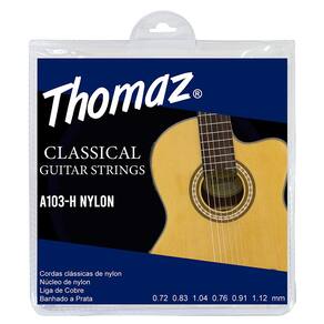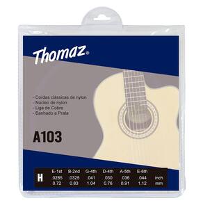 Jogo com 6 cordas clássicas de nylon sendo 3 com revestimento em liga de cobre banhado a prata e 3 em nylon transparente, ideal para iniciantes.Especificações - Marca: Thomaz- Modelo: A103-H- Aplicação: ViolãoE-1ª – 0.0285 inch | 0.72 mmB-2ª – 0.0325 inch | 0.83 mmG-4ª – 0.041 inch | 1.04 mmD-4ª – 0.030 inch | 0.76 mmA-5ª – 0.036 inch | 0.91 mmE-6ª – 0.044 inch | 1.12 mmConteúdo da Embalagem - 100 Jogos de Encordoamento Violão Nylon 103H Thomaz- Dimensões da Embalagem (AxLxP): 9 x 14 x 20 cm*Imagens meramente ilustrativas