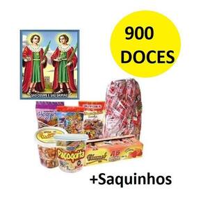 Kit Para 100 Pessoas Com 900 Doces + Saquinhos Cosme E Damião Kit ideal para o dia de Cosme e Damião São 8 tipos diferentes de doces. Acompanha saco e fecho para embalar.