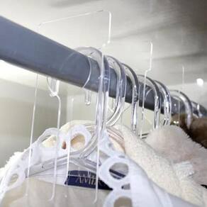 Separadores de cabides em acrílico, ajuda a organizar e facilitar o dia a dia no closet. O ideal é etiquetar a peça com descrição por tamanhos, cores, estação do ano, roupas de festa, etc.