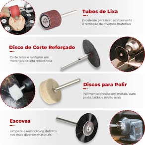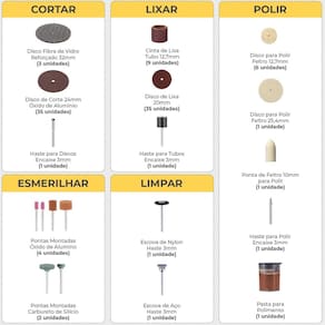 Kit 105 Acessórios Essenciais para Micro Retífica Completo Padrão Dremel Multimarcas Dremax. Com Discos de Corte, Lixa, Polimento Escovas e Pontas Montadas Kit com 105 Acessórios para Micro Retífica Completo Dremax. Com 105 peças para lixar, polir, cortar, esmerilhar, limpar, gravar, desbastar, furar, etc. - Marca: Dremax - Modelo: KA-105 - Kit completo com 105 peças para lixar, polir, esmerilhar, limpar, gravar, desbastar e furar - Hastes de 3mm padrão de todas as micro retíficas - Uso em micro retíficas de qualquer marca - Peso bruto: 162 gramas - : 90 dias contra defeitos de fabricação Itens Inclusos: - 3 Discos de Corte 32mm Reforçados - 35 Discos De Corte 24mm - 35 Discos De Lixa 20mm - 9 Tubos De Lixa 12,7mm - 1 Disco de Polimento 25,4mm - 6 Discos de Polimento 12,7mm - 1 Ponta de Feltro 10mm - 1 Ponta Montada 10mm Carboneto de Silício verde - 1 Ponta Montada 20mm Carboneto de Silício verde - 1 Ponta Montada 9,5mm Óxido de Alumínio laranja - 1 Ponta Montada 14,3mm Óxido de Alumínio laranja - 1 Ponta Montada 6mm Óxido de Alumínio rosa - 1 Ponta Montada 6mm Arredondada Óxido de Alumínio rosa - 1 Escova Copo 12mm Aço - 1 Escova 20mm Nylon - 1 Suporte para Tubo de Lixa 12,7mm - 1 Suporte para Discos de Corte e Lixa - 1 Suporte para Disco de Feltro - 1 Pasta de Polimento - 1 Pedra para Afiar - 2 Potes Plásticos Marca: Não Informado Ean: 7898752020000