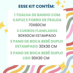 Kit enxoval bebê 10 peças 3 cueiro bebê flanelado + 6 pano de boca 3 estampados + 3 lisos + 1 toalha de banho com capuz e forro de fralda 70x80cm 100% algodão Especificações do kit / conjunto Total de produtos: 10 peças Contém 1 toalha de banho com capuz e forro de fralda 70x80cm Contém 3 cueiros flanelados 80x60cm estampado Contém 6 panos de boca bebê duplo estampado 30x30 cm 3 estampados + 3 liso Principais características: Composição: Kit completo 100% algodão e com toque flanelado Idade: a partir do primeiro dia de vida Estampas: feminino estampas Extra absorvente Tecido duplo ou seja, existe duas camadas para maior durabilidade Cuidados Leia atentamente a descrição Seguir as recomendações da etiqueta do produto para maior durabilidade do produto Lavar a mão ou lavar suavemente em 30 graus. Não alvejar Não centrifugar Secagem em varal, na horizontal e na sombra Passar em temperatura média de 150 Não limpar a seco Não remover manchas com solventes Dúvidas e informações Nos preocupamos muito com a satisfação dos nossos clientes, e estamos sempre a disposição para quaisquer dúvidas ou informações entrando em contato. Com muito carinho agradecemos a preferência, e desejamos que goste do pedido Obrigada Marca: Não Informado Ean: 7898144791327