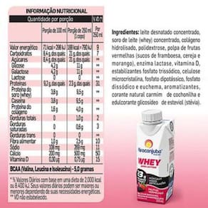 Kit 12 Bebidas Piracanjuba Whey 250 Ml - Frutas VermelhasO piracanjuba whey é uma bebida láctea proteica, composta de:23g de proteínas5g de bcaa4g de colágenoEste não é um alimento baixo ou reduzido em valor energético Piracanjuba whey frutas vermelhasIngredientes: leite desnatado concentrado, soro de leite whey concentrado, colágeno hidrolisado, polidextrose, polpa de frutas vermelhas sucos de framboesa, cereja e morango , enzima lactase, vitamina d, estabilizantes fosfato trissódico, celulose microcristalina, fosfato dipotássico, fosfato dissódico e euchema, aromatizantes, corante natural carmim de cochonilha e edulcorante glicosídeo de esteviol stevia . Alérgicos: contém leite e derivados.Não contém glúten.