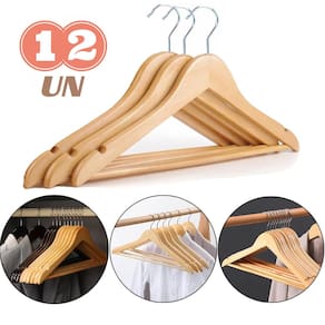 Kit 12 Cabides Madeira Marfim Com Verniz Gancho Cromado Roupas