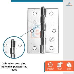 - Tipo leve, polido e pino solto; - Dobradiças de canto para portas e janelas de madeira mista (portas oca); - Acabamento zincado.