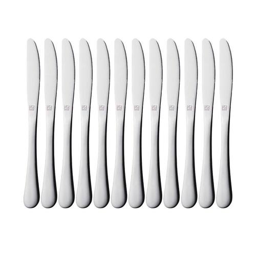 Composição: - 12 Facas de mesa Ponta arredondada : 22,6 cm; tamanho lâmina 12cm e espessura 3 mm