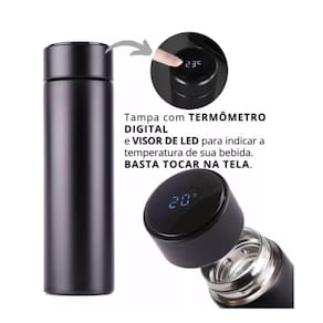 - A garrafa térmica inteligente inox portátil possui acabamento de altíssima qualidade, com uma incrível tela LED, localizada na tampa sensível ao toque, ela te mostra, em tempo real, a temperatura interna da garrafa.