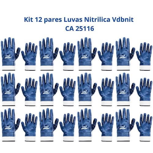 Kit 12 pares Luvas Nitrílica VDBNIT Punho de Lona CA 25116 Proteção Contra Produtos Químicos e Mecânicos A luva nitrílica VDBNIT punho de lona da Volk foi desenvolvida para garantir proteção e durabilidade em atividades que exigem resistência a produtos químicos e mecânicos. Com revestimento em borracha nitrílica e punho de lona, ela oferece conforto, segurança e excelente desempenho.