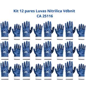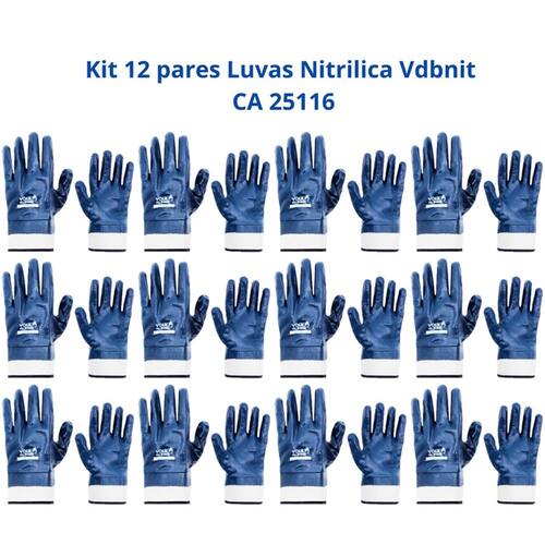 Kit 12 pares Luvas Nitrílica VDBNIT Punho de Lona CA 25116 Proteção Contra Produtos Químicos e Mecânicos A luva nitrílica VDBNIT punho de lona da Volk foi desenvolvida para garantir proteção e durabilidade em atividades que exigem resistência a produtos químicos e mecânicos. Com revestimento em borracha nitrílica e punho de lona, ela oferece conforto, segurança e excelente desempenho.