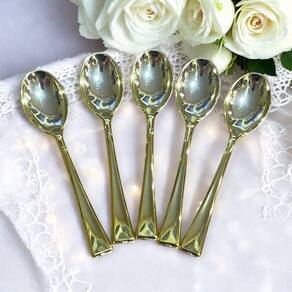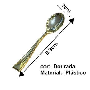 Kit 12 Mini Colher Dourada Descartável Para Doce Bolo De Pote Contém: 12 unidades Mini Colher Dourada Plástico Descartável 9.8cm