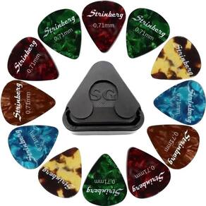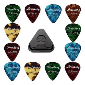 Kit 12 Palhetas Strinberg 0.71mm Para Violão + Porta Palhetas Kit com 12 palhetas para guitarra e violão strinberg 0.71mm medium As palhetas strinberg proporcionam todo o conforto e a pegada que você procura para tirar o melhor som na sua guitarra ou violão Apresentam um corpo mais amplo e uma ponta arredondada o que tornaram este formato de palheta a escolha favorita de músicos de diversos estilos diferentes. As palhetas strinberg são fabricadas em celuloide, que é um dos materiais preferidos para palhetas entre os músicos. Palhetas de celuloide dão a sensação de toque natural ao músico, com uma superfície lisa marcante e um tom musical quente e rico em preenchimento. Dimensões das palhetas: 30 mm altura x 26 mm largura . Espessura das palhetas: 0.71mm / medium Cor: coloridas // material: celuloide Conteúdo da embalagem: 12 palhetas strinberg 0.71mm medium Fornecedor: sonotec / musimax distribuidor oficial dos produtos strinberg no brasil + Porta palhetas preto adesivo para guitarra e violão sg izzo Dimensões do porta palhetas: 40 mm altura x 40 mm largura . Fornecedor: izzo instrumentos musicais Conteúdo da embalagem: 01 porta palhetas adesivo preto Marca: Não Informado