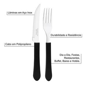 Você que precisa de talheres de qualidade na hora de receber seus convidados!Agora você tem os Talheres Tramontina Leme Inox Cabo Preto é perfeita para essa ocasião.Eles são produzidos com lâmina em aço inox tem maior durabilidade devido ao tratamento térmico e possui cabo em polipropileno proporcionando maior durabilidade e resistência para o uso no seu dia a dia.Além de tudo isso, pode ir à máquina de lavar louças facilitando seu dia a dia ainda mais.Este modelo é ideal para festas, restaurantes, buffet, bar e hotéis. Legal né? Compartilhe com seus Amigos!Conteúdo do Kit:6 – Facas de Churrasco Tramontina Leme Inox Cabo Preto.6 - Garfos de Mesa Tramontina Leme Inox Cabo Preto.Características do produto:Lâmina: Em Aço Inox; Cabo: Polipropileno Preto.Dimensões Produto (Compr. X Larg. X Alt.):Faca: 20,2 cm x 0,9 cm x 1,8 cmGarfo: 18,5 cm x 2,3 cm x 1,3 cmTAGS e palavras chave do produto:Restaurantes, Talheres, Faqueiro, Buffet, Bar, Hotel, Faca de Serra, Faca de Serrinha, Faca de Churrasco, Faca Para Churrasco, Faca de Mesa, Faca Para Carne 4 Polegadas, Garfo, Garfo de Churrasco, Garfo Para Churrasco, Garfo de Mesa, Talher, Talheres Uso Diário, Jogo de Talheres, Faqueiro, Jogo de Faqueiros, Jogo de Colheres, Conjunto de Colheres, Cabo Preto, Tramontina.*imagens ilustrativas.Os objetos que ambientam as imagens, não acompanham o produto. Fique atento: As cores das imagens podem sofrer alterações devido a luminosidade, configurações do monitor e até mesmo a percepção do usuário.