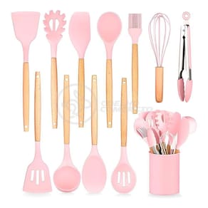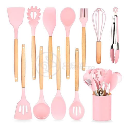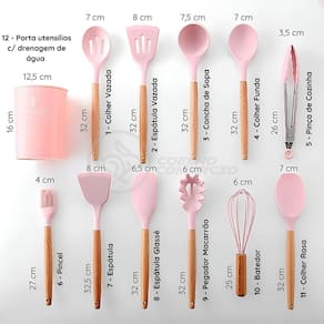 Nosso kit é composto por 12 utensílios essenciais para qualquer cozinha: espátula perfurada, concha, pegador de espaguete, colher perfurada, espátula para wok, espátula de colher, colher sólida, espátula pontuda, pinças, batedor e pincel de confeiteiro. Cada utensílio é feito de silicone premium, para superfícies antiaderentes e com cabos de madeira ergonômicos que proporcionam conforto durante o uso. Além disso, o kit inclui um pote elegante para armazenar todos os utensílios, mantendo sua cozinha organizada e estilosa.
