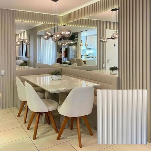 Kit 12 Placas Ripado 3D Sala Decorativo Parede PVC Painel Quantidade: 12 Material: Poliestireno Alto Impacto Modelo: Ripa Cor: Brancas com acabamento fosco e corte a laser. Espessura: 0.5mm Tamanho: 50x50