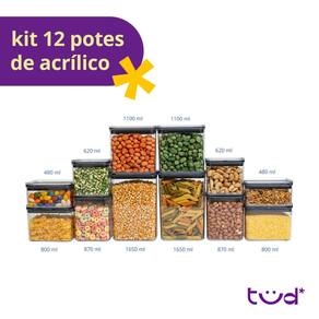 "Oii! Tüd bem? Vem saber mais sobre o kit de 12 potes de acrílico de 480ml, 620ml, 800ml, 870ml, 1,1L e 1650ml com tampa herméticos quadrados da Tüd!