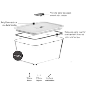 Cuidados: não lavar com materiais abrasivos; - Cozinhe no forno ou air fryer até 220C; - Leve ao freezer até -20C para congelar alimentos; - Aqueça sua comida no micro-ondas com a válvula aberta; - Pode ser levado à lava-louças para facilitar a limpeza; - Fabricado em material livre de BPA.