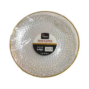 Kit 12 Pratos Jantar Redondo Acrílico Borda Dourado 25Cm