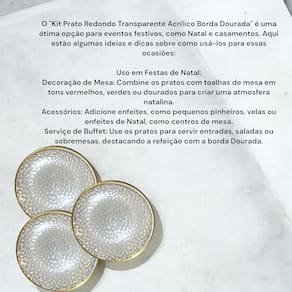 Contém: 12 unidades Pratos Refeição Redondo Transparente Acrílico Borda Dourada 25,3cm