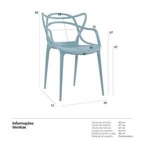 Cadeira modelo Allegra: Material: Polipropileno - Altura do encosto: 82 cm - Altura do assento: 47 cm - Largura do assento: 40 cm - Profundidade do assento: 40 cm - Altura dos braços: 67 cm - Largura dos braços: 51 cm - Distância entre os pés: 48 cm - Peso suportado: 130 kg - Produto certificado pelo INMETRO - Garantia: 3 meses.