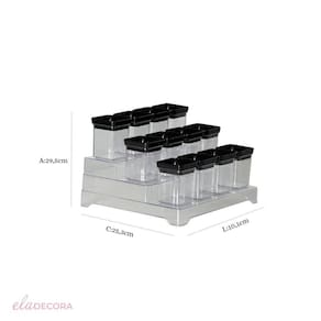 Kit 13 Porta Temperos Lumini Black Decorativo Organizador Descrição do Produto O Kit Porta Temperos Lumini é a solução perfeita para quem busca praticidade e organização na cozinha. Composto por 12 mini potes e 1 suporte, esse conjunto oferece um design elegante e funcional, além de contar com uma tampa preta que proporciona um toque de sofisticação ao ambiente.