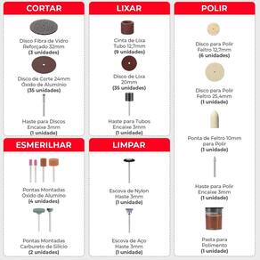 Kit com 135 Acessórios para Micro Retífica Completo Dremax. Com 135 peças para lixar, polir, cortar, esmerilhar, limpar, gravar, desbastar, furar, etc. - Marca: Dremax - Modelo: KA-135 - Kit completo com 135 peças para lixar, polir, esmerilhar, limpar, gravar, desbastar e furar - Hastes de 3mm padrão de todas as micro retíficas - Uso em micro retíficas de qualquer marca - Peso bruto: 250 gramas - : 90 dias contra defeitos de fabricação Itens Inclusos: - 3 Discos de Corte 32mm Reforçados - 30 pontas diamantadas com pontas de diferentes formatos - 35 Discos De Corte 24mm - 35 Discos De Lixa 20mm - 9 Tubos De Lixa 12,7mm - 1 Disco de Polimento 25,4mm - 6 Discos de Polimento 12,7mm - 1 Ponta de Feltro 10mm - 1 Ponta Montada 10mm Carboneto de Silício verde - 1 Ponta Montada 20mm Carboneto de Silício verde - 1 Ponta Montada 9,5mm Óxido de Alumínio laranja - 1 Ponta Montada 14,3mm Óxido de Alumínio laranja - 1 Ponta Montada 6mm Óxido de Alumínio rosa - 1 Ponta Montada 6mm Arredondada Óxido de Alumínio rosa - 1 Escova Copo 12mm Aço - 1 Escova 20mm Nylon - 1 Suporte para Tubo de Lixa 12,7mm - 1 Suporte para Discos de Corte e Lixa - 1 Suporte para Disco de Feltro - 1 Pasta de Polimento - 1 Pedra para Afiar - 2 Potes Plásticos Marca: Dremax Ean: 7734625997652