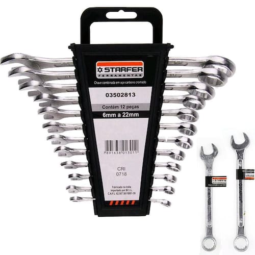 Características técnicas: Material: Aço carbono níquel-cromado Medidas: 6 a 22mm Quantidade: 14 peças + suporte plástico Tipo de chave: Combinado Marca: Starfer