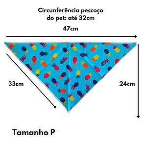 O kit conta com 3 tamanhos diferentes: P, M e G. O tamanho P possui as seguintes medidas: 47cm x 33cm x 24cm c x l x a e circunferência do pescoço de 20cm à 32cm. O tamanho M possui as seguintes medidas: 56cm x 41cm x 30cm c x l x a e circunferência do pescoço de 32cm à 38cm. O tamanho G possui as seguintes medidas: 66cm x 53cm x 40cm c x l x a e circunferência do pescoço de 38cm à 46cm. No kit, você receberá 5 unidades de cada tamanho, totalizando 15 bandanas.