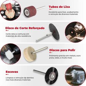 Kit com 150 Acessórios para Micro Retífica Completo Dremax. indicado para lixar, polir, cortar, esmerilhar, limpar, gravar, desbastar, furar, etc. - Marca: Dremax - Modelo: KA-150 - Kit completo com 150 peças para lixar, polir, esmerilhar, limpar, gravar, desbastar e furar - Hastes de 3mm padrão de todas as micro retíficas - Uso em micro retíficas de qualquer marca - Peso bruto: 250 gramas - : 90 dias contra defeitos de fabricação Itens Inclusos: - 18 Discos de Corte 32mm Reforçados - 30 pontas diamantadas com pontas de diferentes formatos - 35 Discos De Corte 24mm - 35 Discos De Lixa 20mm - 9 Tubos De Lixa 12,7mm - 1 Disco de Polimento 25,4mm - 6 Discos de Polimento 12,7mm - 1 Ponta de Feltro 10mm - 1 Ponta Montada 10mm Carboneto de Silício verde - 1 Ponta Montada 20mm Carboneto de Silício verde - 1 Ponta Montada 9,5mm Óxido de Alumínio laranja - 1 Ponta Montada 14,3mm Óxido de Alumínio laranja - 1 Ponta Montada 6mm Óxido de Alumínio rosa - 1 Ponta Montada 6mm Arredondada Óxido de Alumínio rosa - 1 Escova Copo 12mm Aço - 1 Escova 20mm Nylon - 1 Suporte para Tubo de Lixa 12,7mm - 1 Suporte para Discos de Corte e Lixa - 1 Suporte para Disco de Feltro - 1 Pasta de Polimento - 1 Pedra para Afiar - 2 Potes Plásticos Marca: Não Informado