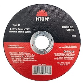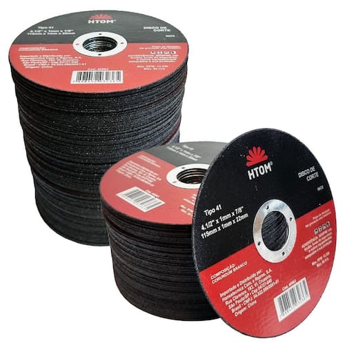 Kit com 150 Discos de Corte Fino 4 1/2 Pol. 115mm para Esmerilhadeira Inox Metal HTOM Disco de corte 115mm indicado para cortar inox e metal com esmerilhadeiras. Furo de 22mm e espessura de 1mm. - Marca: HTOM - Referência: HTOM-40563-150x - Kit com 150 Discos - Diâmetro: 4-12 115mm - Furo: 7/8 22m - Espessura: 1mm - Indicado para corte de metais em geral e aço inoxidável - Rotação máxima: 13.300 rpm - Composição: corundum branco - : 90 dias contra defeito de fabricação Marca: Não Informado