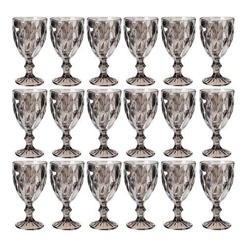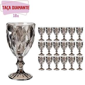 KIT 18 TAÇA DIAMANTE CINZA METALIZADO 340ML Taça Diamante traz um toque de sofisticação e elegância para sua mesa, tornando o momento de servir especial, para você, seus familiares e visitas, com brindes muito mais graciosos. A Taça é produzida com vidro resistente e fácil de limpar.
