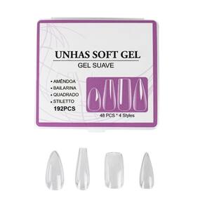 Características Principais: - 192 unidades; - 4 modelos de unhas diferentes; - 48 unidades de cada modelo; - Transparente; - Fácil aplicação; - Aparência natural; - Material PVC levemente flexível, diminuindo o risco de quebra no uso diário; - Compatível com aplicação em gel e acrílico, além do esmalte comum; - Formato almond afilado e elegante; - Formato bailarina com base larga que afina nas pontas; - Formato quadrado clássico com pontas retas; - Formato stiletto pontiagudo e ousado.