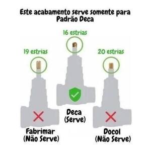 Acabamento para registros padrão DECA ou similar.Serve nas medidas de 1/2'', 3/4'' e 1'' polegada, em registros da marca DECA ou em registros que seguem os mesmos padrões DECA de 16 estrias. Seu processo de cromação que passa por uma etapa de secagem em estufa por 160 horas, garantindo melhor aderência do acabamento a matéria prima, levando qualidade e ergonomia. Compatível com as seguintes Marcas :DECA, Sigma, Furkin, Admo, Oriente Atual, Forusi, Bognar, Bometal, Stoc Metais, e demais fabricantes que seguem o mesmo padrão de 16 estrias. Não e compatíveis com as seguintes Marcas:DOCOL, Lorenzetti, Meber, Fabrimar e demais fabricantes que seguem o mesmo padrão. Especificações TécnicasDimensões:CanoplaAltura: 3,4 cmLargura: 5,5 cmVolanteAltura: 6 cmLargura: 3 cm. Peso: 240 gramasCor: Preto fosco. Fixação - ParedeUso - GeralMaterial - 100% Liga de Cobre Metal Acabamento - Preto 4 Camadas de Cromo.Acionamento - Convencional ou 1/4 de Volta. Item incluso:2 Kit acabamento Instalação:Para que o acabamento dê certo o castelo do registro tem de estar com 6 cm a 8 cm para fora da parede, caso contrário o produto não dará certo.