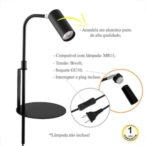 A arandela multifuncional minimalista pode ser uma peça chave e prática para seu cômodo, como na cabeceira da cama, sala, espaço de lazer e entre outros ambientes. A arandela é ajustável em ângulo, ou seja, você pode direcionar tanto a luz quanto toda sua estrutura exatamente para onde desejar. Além disso, já possui em sua estrutura o interruptor para ligar e desligar a luminária, e, também, uma prateleira para colocar seus acessórios diversos, otimizando espaço juntamente por conta disso. Ideal para um espaço de leitura ou lazer, tendo uma luz mais direcionada para onde deseja.Neste kit contém:- 02 unidades da arandela -Descrição da arandela:- Material: Alumínio- Cor: Preto- Medidas:Cúpula:-- Comprimento: 9cm-- Diâmetro : 3,8cmEstrutura:-- Comprimento total: 15cm-- Altura total: 42cm-- Largura total: 18,5 cm Prateleira : 15cm Comprimento do fio: 170cm Base que fixa na parede:-- Altura: 12cm-- Comprimento: 2cm- Compatível com lâmpada: MR11;- Soquete: Gu10;- Tensão: Bivolt. Lâmpada não inclusa