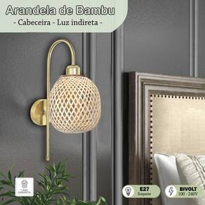 Kit 2 Arandela Bambu Dourada Fibra Natural Cabeceira Nat92 + Led Uma elegante arandela dourada com cúpula de bambu combina sofisticação e naturalidade em um único design. A base dourada, com acabamento polido, adiciona um toque de requinte e luxo, refletindo suavemente a luz e criando um ambiente acolhedor. A cúpula, feita de tiras de bambu trançadas ou entrelaçadas, confere um aspecto artesanal e orgânico, filtrando a iluminação de forma suave e aconchegante. Esse contraste entre o brilho metálico e a textura natural do bambu torna a peça versátil, ideal para ambientes modernos, rústicos ou boho, proporcionando um charme especial a qualquer espaço.