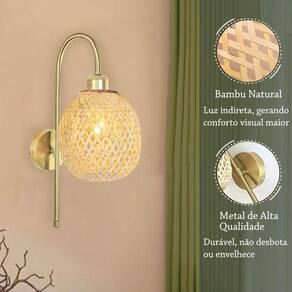 Uma elegante arandela dourada com cúpula de bambu combina sofisticação e naturalidade em um único design. A base dourada, com acabamento polido, adiciona um toque de requinte e luxo, refletindo suavemente a luz e criando um ambiente acolhedor. A cúpula, feita de tiras de bambu trançadas ou entrelaçadas, confere um aspecto artesanal e orgânico, filtrando a iluminação de forma suave e aconchegante. Esse contraste entre o brilho metálico e a textura natural do bambu torna a peça versátil, ideal para ambientes modernos, rústicos ou boho, proporcionando um charme especial a qualquer espaço.