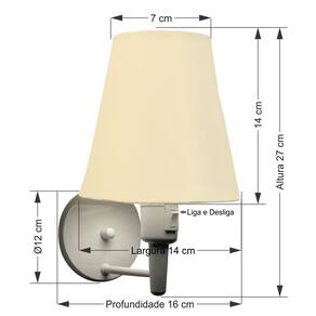Kit/2 Arandela de parede Cone Md-2013 Branca C/ Inter Liga e Desl Cúpula Tecido Algodão CrúAs arandelas Lustres Vivare são elementos versáteis e elegantes que podem transformar qualquer ambiente em um espaço cheio de estilo. Seja para adicionar uma iluminação suave, destacar uma parede ou criar um efeito de luz diferenciado.Dimensão:Cúpula em Tecido: 14x07x14cm Arandela de parede Montada: Altura 27cm Largura 14cm Profundidade 16cm Formato: Cone Tamanho: Pequeno Especificação:Material: Cúpula em Tecido Estrutura em Alumínio Base Parede: Diâmetro 11x1,2cm Resistente: Á Maresia Voltagem: 110V/220V Liga e Desliga: Interruptor no Soquete Tipo de Soquete: E27 Tipo de Lâmpada: Led Bulbo até 16w ou Fluorescente Espiral até 25w Cada Capacidade de Lâmpadas: 1 Observação:Acompanha Lâmpada: Não Possui Led Integrado: Não Garantia: 12 Meses Manual de Instalação: Sim Arandela de parede Montada: Sim Controle de Luminosidade: Não Tipo de Embalagem: Caixa Conservação e Manutenção do Produto:A Limpeza deve ser realizada com o produto desligado. Remova o lustre que pode ser lavado com sabão neutro. Nunca utilize produtos químicos e abrasivos Antes de comprar o seu produto verifique as medidas, o local onde pretende instalar e se necessário o serviço de um profissional qualificado.