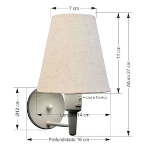 Kit/2 Arandela de parede Cone Md-2013 Branca Com Interuptor Liga e Desliga Cúpula Tecido - Rustico BegeAs arandelas Lustres Vivare são elementos versáteis e elegantes que podem transformar qualquer ambiente em um espaço cheio de estilo. Seja para adicionar uma iluminação suave, destacar uma parede ou criar um efeito de luz diferenciado.Dimensão:Cúpula em Tecido: 14x07x14cm