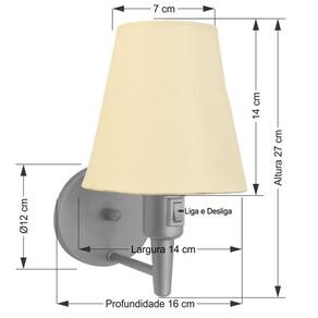 Kit/2 Arandela de parede Cone Md-2013 Cinza C/ Inter Liga e Desl Cúpula Tecido Algodão CrúAs arandelas Lustres Vivare são elementos versáteis e elegantes que podem transformar qualquer ambiente em um espaço cheio de estilo. Seja para adicionar uma iluminação suave, destacar uma parede ou criar um efeito de luz diferenciado.Dimensão:Cúpula em Tecido: 14x07x14cm Arandela de parede Montada: Altura 27cm Largura 14cm Profundidade 16cm Formato: Cone Tamanho: Pequeno Especificação:Material: Cúpula em Tecido Estrutura em Alumínio Base Parede: Diâmetro 11x1,2cm Resistente: Á Maresia Voltagem: 110V/220V Liga e Desliga: Interruptor no Soquete Tipo de Soquete: E27 Tipo de Lâmpada: Led Bulbo até 16w ou Fluorescente Espiral até 25w Cada Capacidade de Lâmpadas: 1 Observação:Acompanha Lâmpada: Não Possui Led Integrado: Não Garantia: 12 Meses Manual de Instalação: Sim Arandela de parede Montada: Sim Controle de Luminosidade: Não Tipo de Embalagem: Caixa Conservação e Manutenção do Produto:A Limpeza deve ser realizada com o produto desligado. Remova o lustre que pode ser lavado com sabão neutro. Nunca utilize produtos químicos e abrasivos Antes de comprar o seu produto verifique as medidas, o local onde pretende instalar e se necessário o serviço de um profissional qualificado.