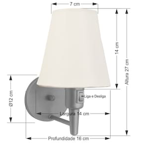 Kit/2 Arandela de parede Cone Md-2013 Cinza C/ Inter Liga e Desl Cúpula Tecido BrancoAs arandelas Lustres Vivare são elementos versáteis e elegantes que podem transformar qualquer ambiente em um espaço cheio de estilo. Seja para adicionar uma iluminação suave, destacar uma parede ou criar um efeito de luz diferenciado.Dimensão:Cúpula em Tecido: 14x07x14cm