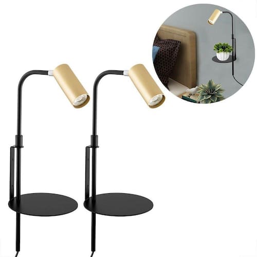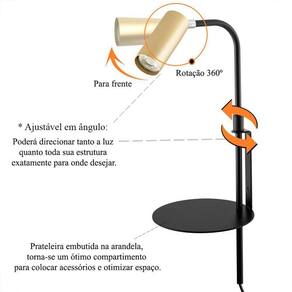 A arandela multifuncional minimalista pode ser uma peça chave e prática para seu cômodo, como na cabeceira da cama, sala, espaço de lazer e entre outros ambientes. A arandela é ajustável em ângulo, ou seja, você pode direcionar tanto a luz quanto toda sua estrutura exatamente para onde desejar. Além disso, já possui em sua estrutura o interruptor para ligar e desligar a luminária, e, também, uma prateleira para colocar seus acessórios diversos, otimizando espaço juntamente por conta disso. Ideal para um espaço de leitura ou lazer, tendo uma luz mais direcionada para onde deseja.Neste kit contém:- 02 unidades da arandela -Descrição da arandela:- Material: Alumínio- Cor:Estrutura: PretoCúpula: Dourado- Medidas:Cúpula:-- Comprimento: 9cm-- Diâmetro : 3,8cmEstrutura:-- Comprimento total: 15cm-- Altura total: 42cm-- Largura total: 18,5 cm Prateleira : 15cm Comprimento do fio: 170cm Base que fixa na parede:-- Altura: 12cm-- Comprimento: 2cm- Compatível com lâmpada: MR11;- Soquete: Gu10;- Tensão: Bivolt. Lâmpada não inclusa