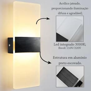 Kit 2 Arandela Interna Sala Acrilico Jateado Led Integrado Lup94 Essa peça tem o poder de deixar qualquer ambiente mais belo e refinado. Imagine em sua casa...Arandela interna, com seu design moderno deixará seu ambiente com um toque a mais de requinte e estilo.Neste kit contem 02 arandelas lup94. Descrição:- material: alumínio e acrílico jateado- cor: preto- pintura: escovado- dimensões: Altura: 27 cm Comprimento: 10 cm Largura: 4 cm- led integrado 3000k incluso- tensão: bivolt- garantia: 1 anosAtenção: a base da arandela não cobre a caixinha de luz 4x2Produto destinado a projetos em que não são deixados a caixinha 4x2Como espera para fixar a arandela. Led integrado, não necessita de lâmpada.
